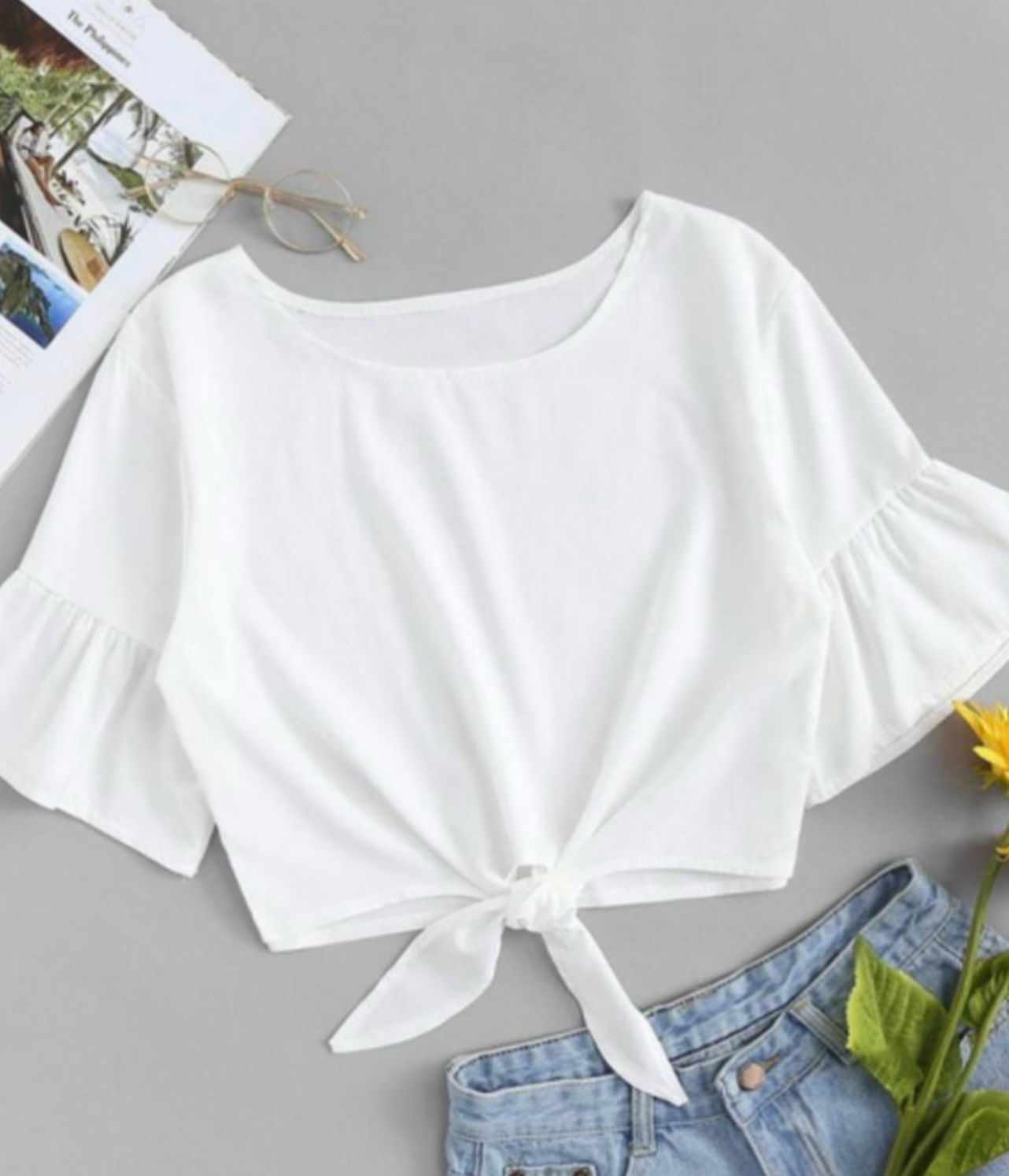 Blusa corta con nudo frontal y mangas sueltas, fresca y perfecta para un look casual y femenino.