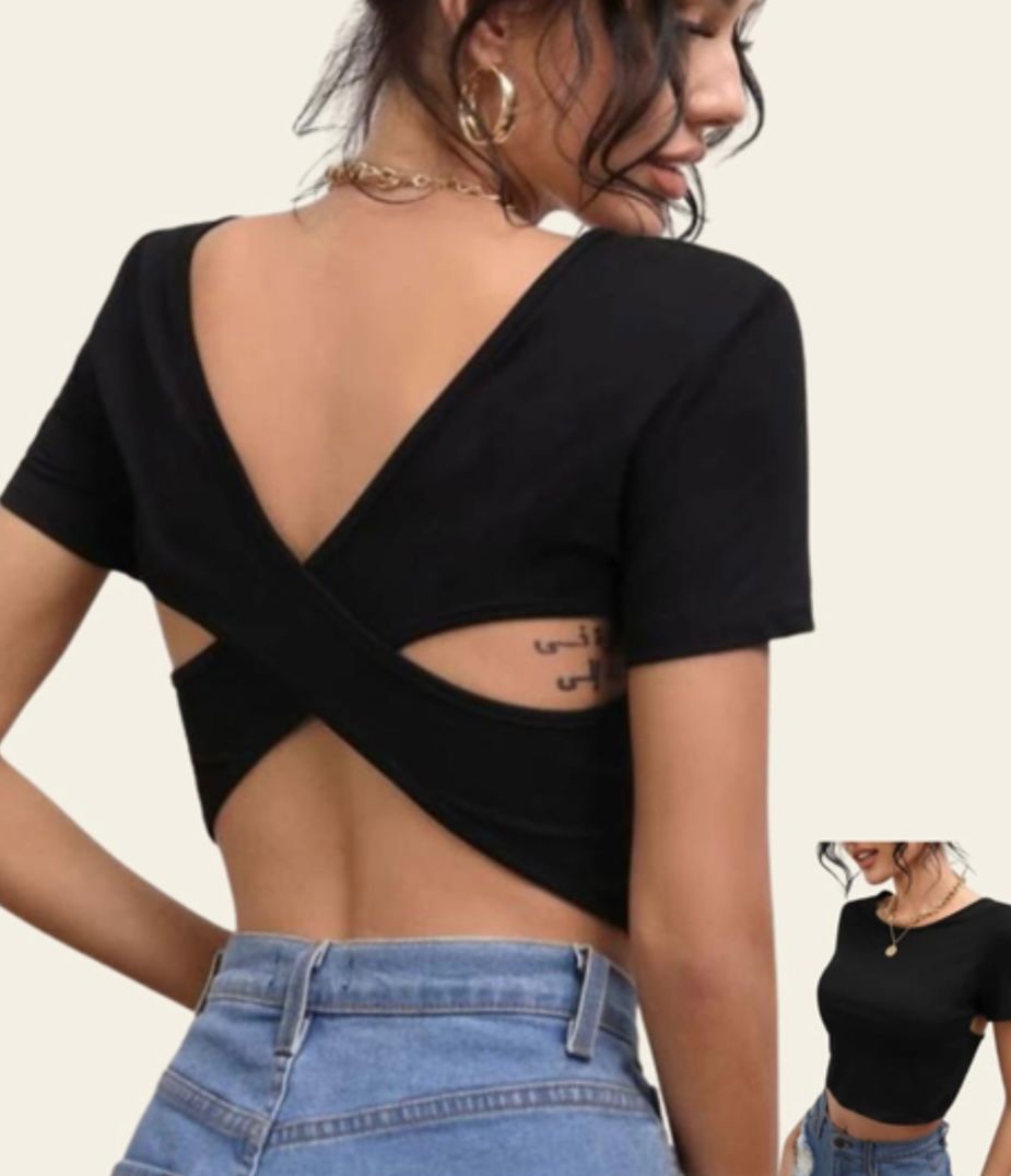 Blusa de manga corta con espalda cruzada y abertura, ideal para un look moderno y atrevido.
