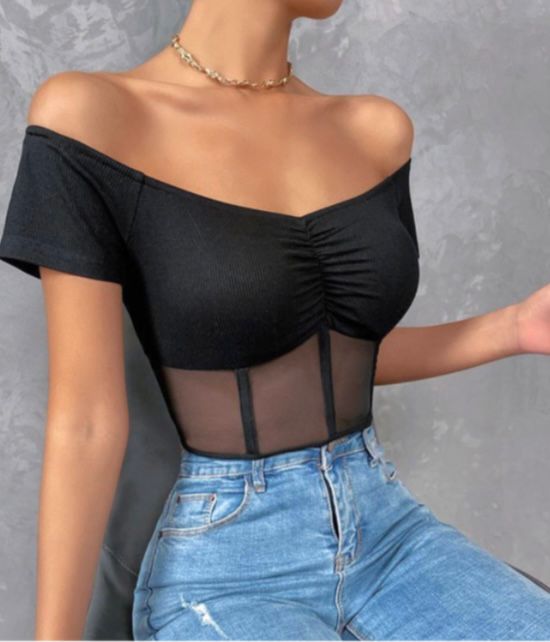 Top negro de diseño elegante con escote bardot que deja los hombros descubiertos, aportando un estilo femenino y sofisticado. Cuenta con panel de malla semitransparente en la parte inferior que añade un toque sensual y actual. Su corte tipo crop estiliza la figura y lo convierte en la prenda perfecta para combinar con jeans, pantalones o faldas de tiro alto. Ideal para looks nocturnos, salidas especiales o outfits urbanos con actitud.