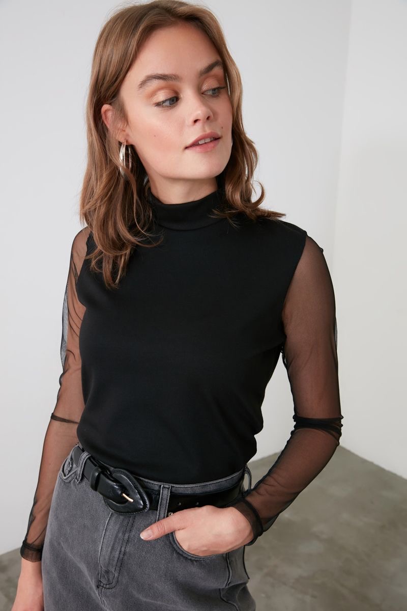 Blusa negra confeccionada en malla semitransparente que aporta un estilo sofisticado y moderno. Su diseño de cuello alto realza el cuello y le da un toque elegante, mientras que las mangas largas transparentes añaden sensualidad y ligereza al look. Ideal para combinar con jeans, pantalones de vestir o faldas, es una prenda perfecta para outfits de noche, eventos especiales o looks urbanos con estilo.